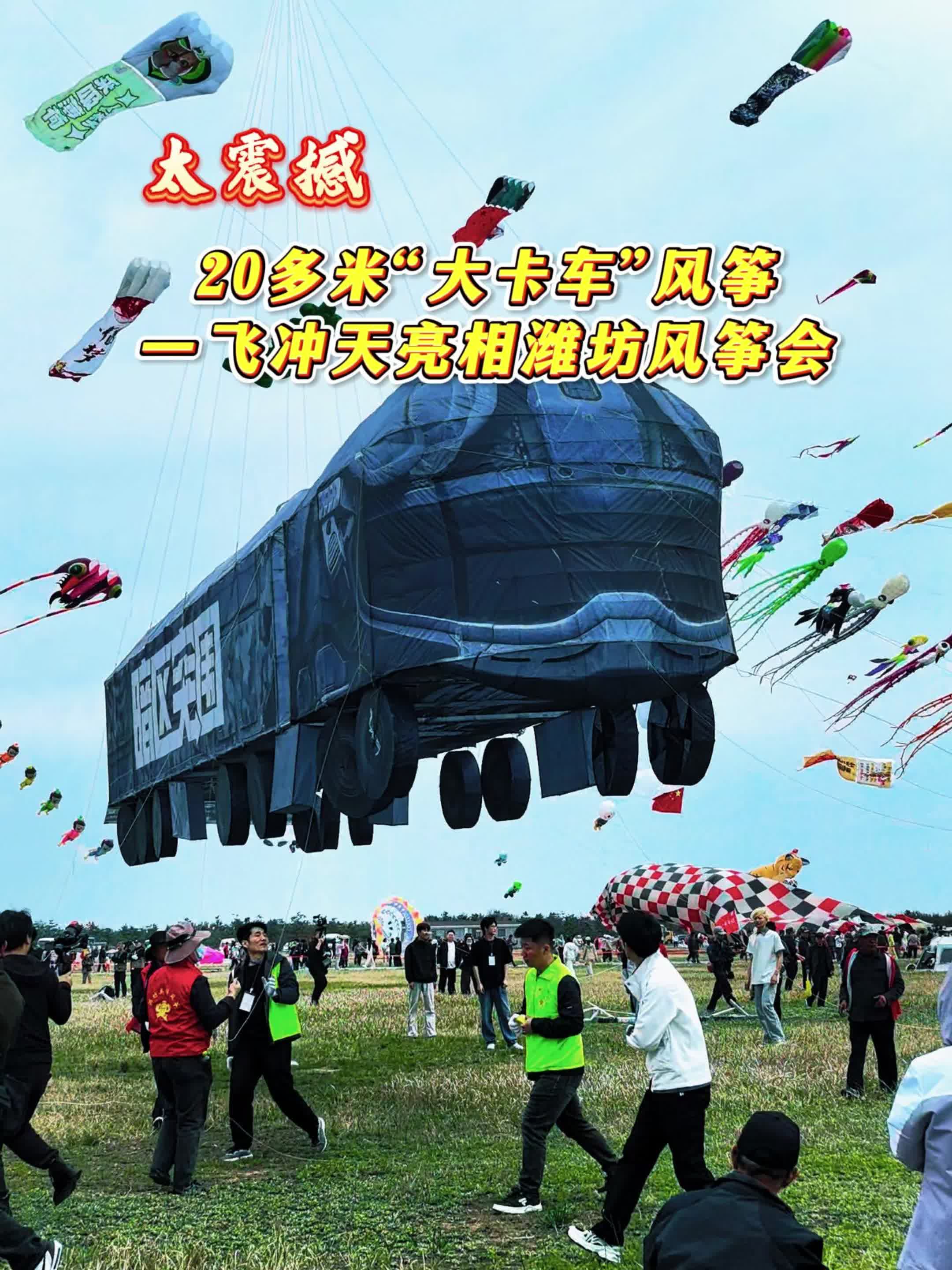 太震撼!20多米“大卡車”風(fēng)箏一飛沖天亮相濰坊風(fēng)箏會(huì)