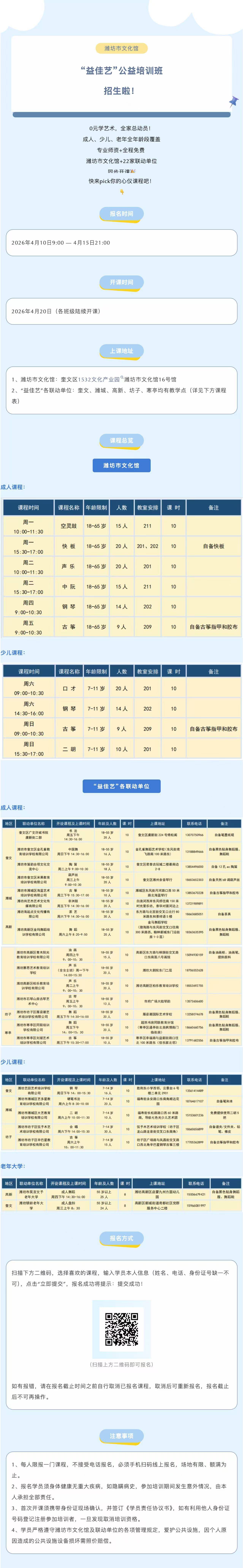 濰坊市文化館“益佳藝”公益培訓(xùn)班開始招生啦!少兒·成人·老年全覆蓋!